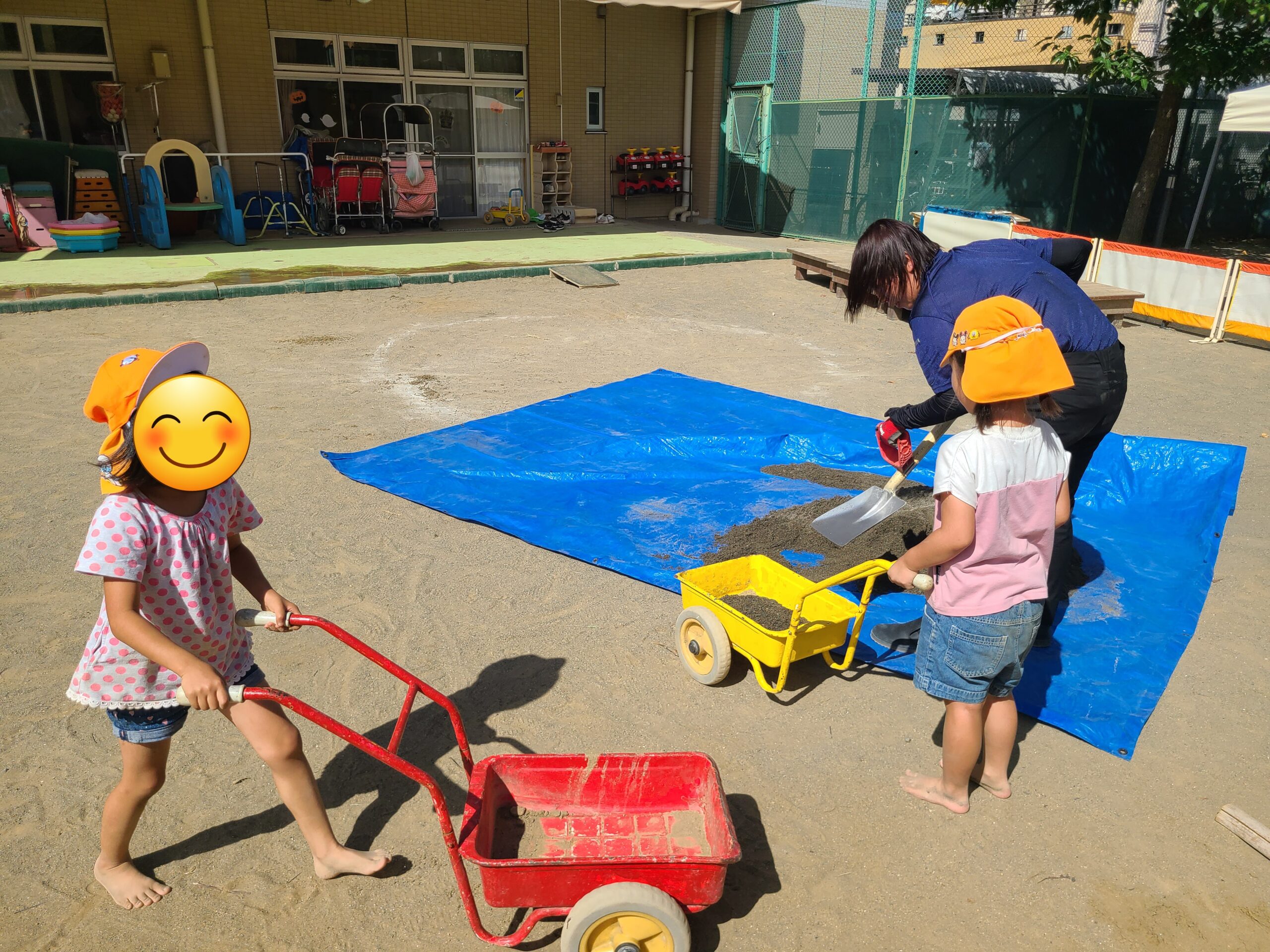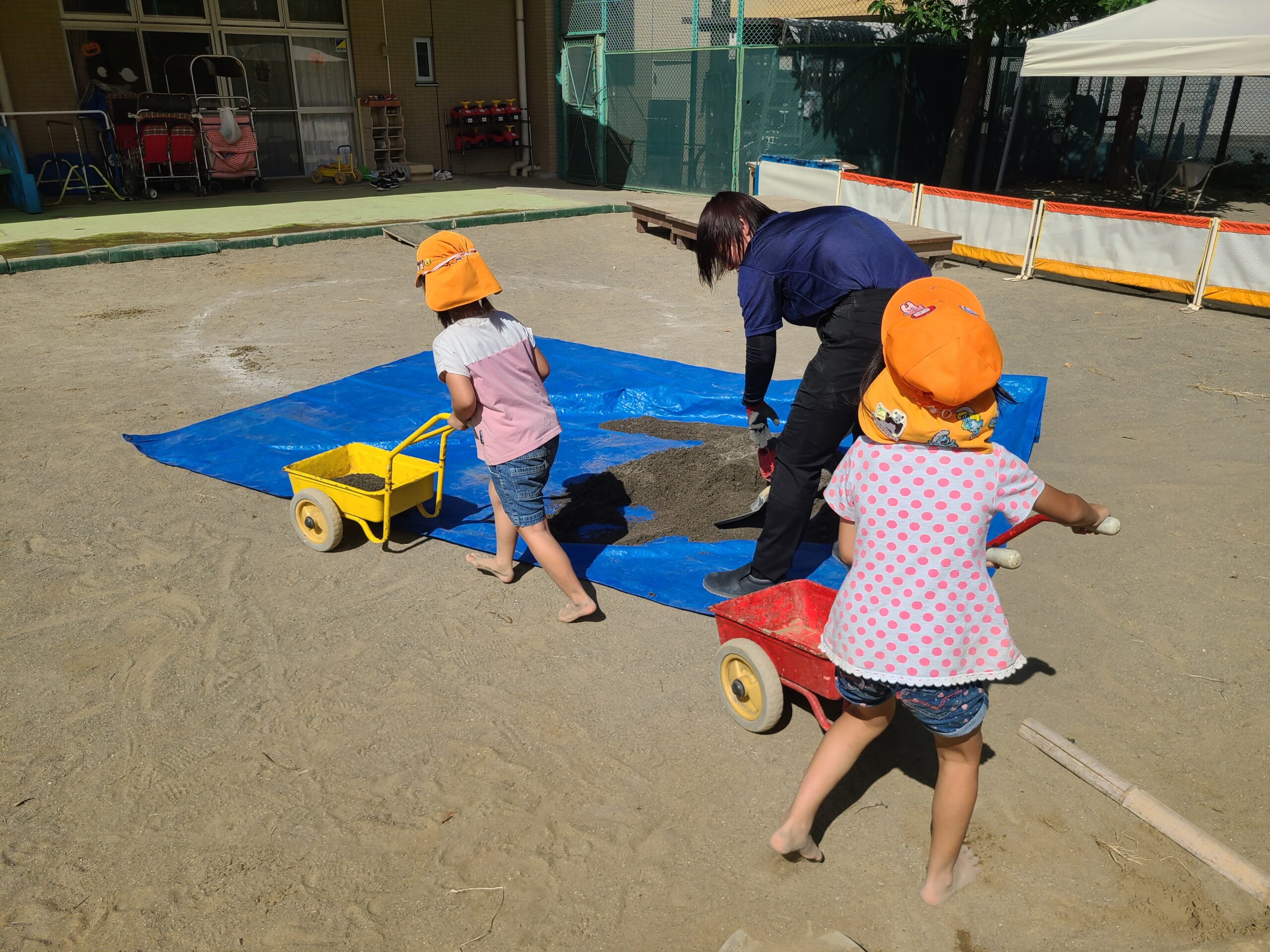砂補充のトラックが来るまで一緒に砂あそび。