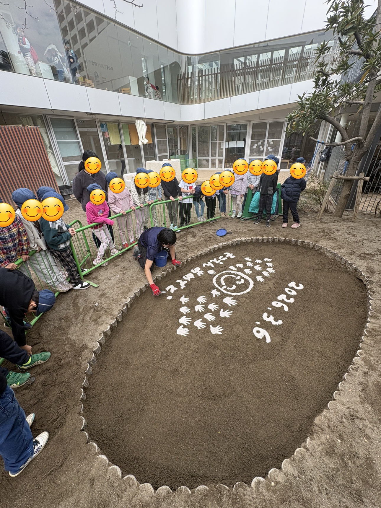 今回は砂場クリーニング終わりに白砂で手形を作り記念撮影を行いました
